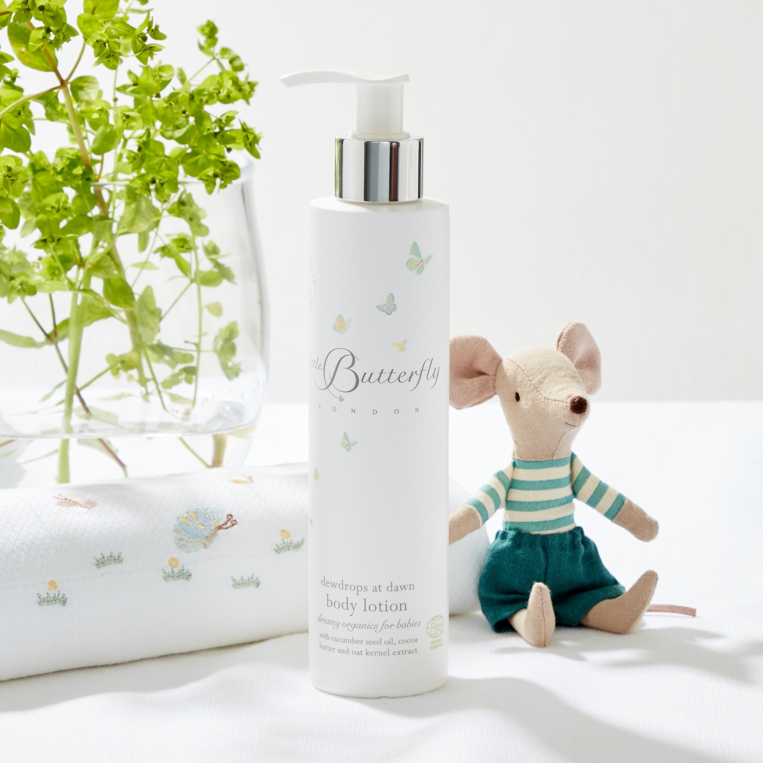 Luxusní tělové mléko pro nejmenší — „Dewdrops at Dawn“ z řady Little Butterfly London nabízí hlubokou hydrataci, jemnou péči a ochranu citlivé dětské pokožky už od narození.