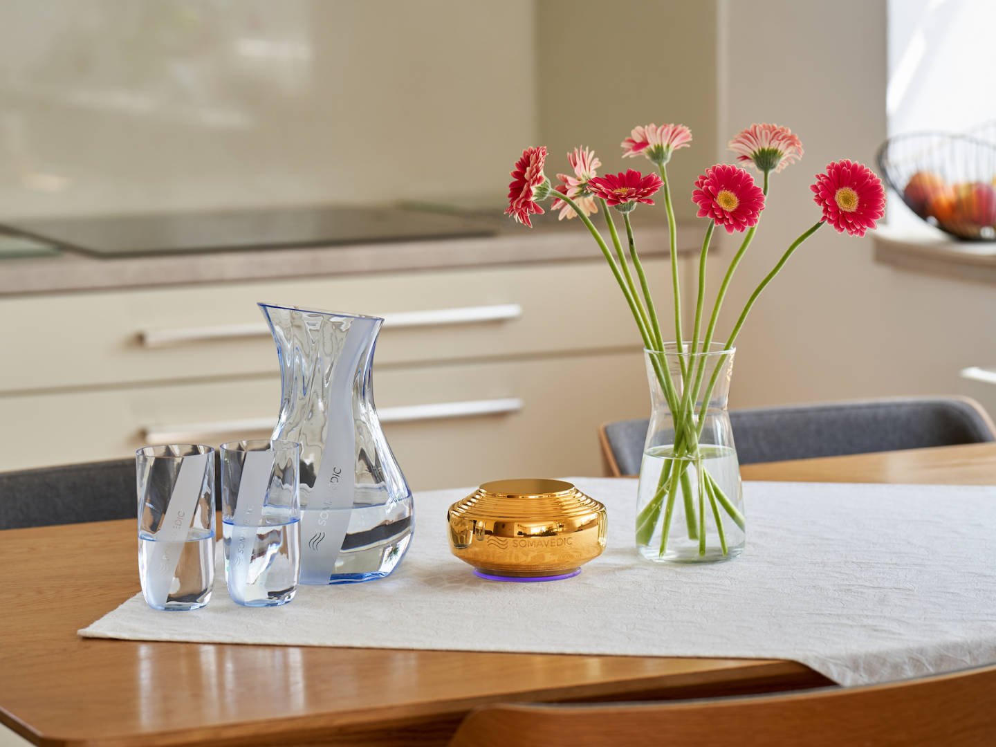 Pro harmonizaci vody: umístěte nádobu s filtrovanou vodou max. 20 cm od zařízení na cca 10‑15 minut – dochází ke strukturální harmonizaci vody.