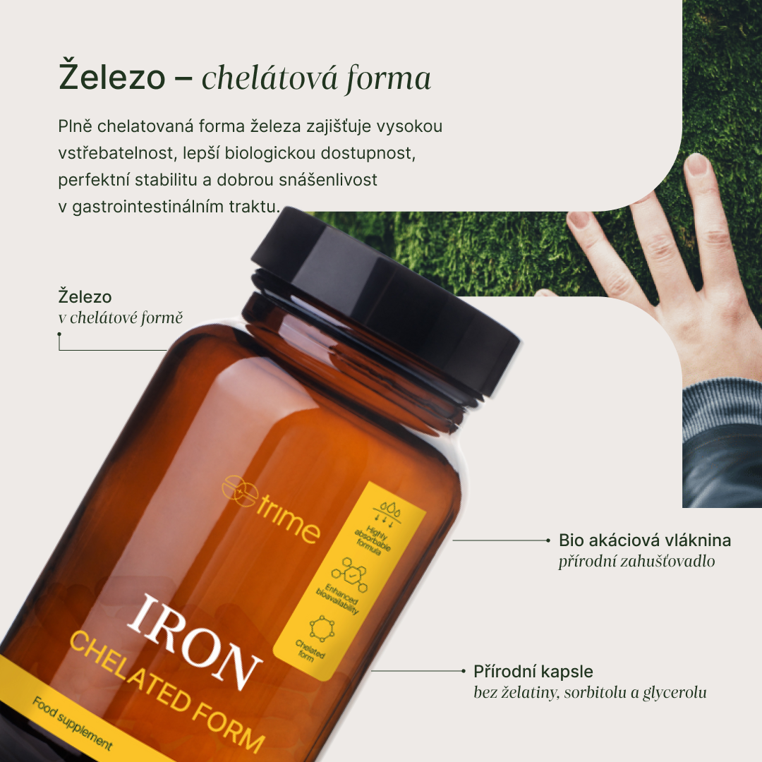 Trime Železo je pečlivě navržený doplněk stravy určený pro podporu optimálního zásobení organismu jedním z klíčových minerálů – železem. Každá kapsle obsahuje 12,5 mg železa ve formě bisglycinátu železnatého, což je plně chelatovaná forma navázaná na dvě molekuly glycinu. Tento patentovaný proces chelatace zajišťuje vysokou vstřebatelnost a šetrnost pro trávicí trakt – uživatelé díky tomu často nezažívají běžné vedlejší účinky železných preparátů, jako jsou zácpa, nauzea nebo žaludeční nevolnost.