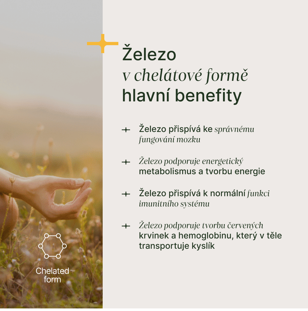 Tento doplněk nabízí 12,5 mg železa ve formě bisglycinátu železnatého v každé kapsli, která je vysoce vstřebatelná a šetrná k žaludku. Je vhodný pro osoby s vyšší potřebou železa – například ženy, sportovce nebo ty, kteří trpí únavou a sníženou tvorbou červených krvinek. Vyniká díky čistému složení, rostlinné kapsli a velmi dobré biologické dostupnosti chelátové formy.
